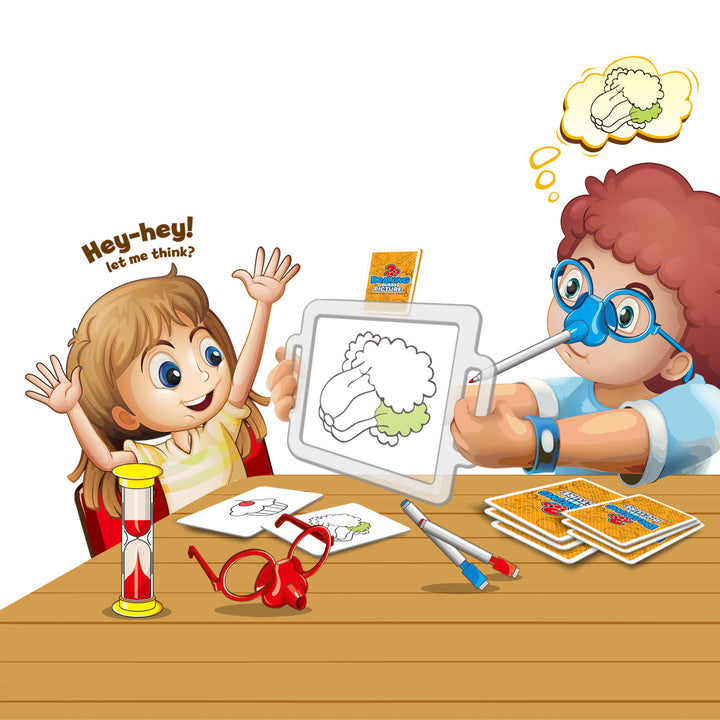 Add laughter to family time with the hilarious Nose Drawing Game! Players wear a funny glasses-and-nose set with a marker attached, then try to draw pictures while others guess. It’s a fun and interactive game that boosts creativity and guarantees endless giggles for kids and adults alike.
