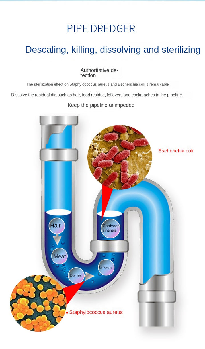 Keep your pipes clean and fresh with this powerful Pipeline Cleaning Agent. Specially formulated to dissolve grease, hair, and residue, it also sterilizes and deodorizes to prevent odors and bacteria buildup — leaving your drains flowing smoothly.